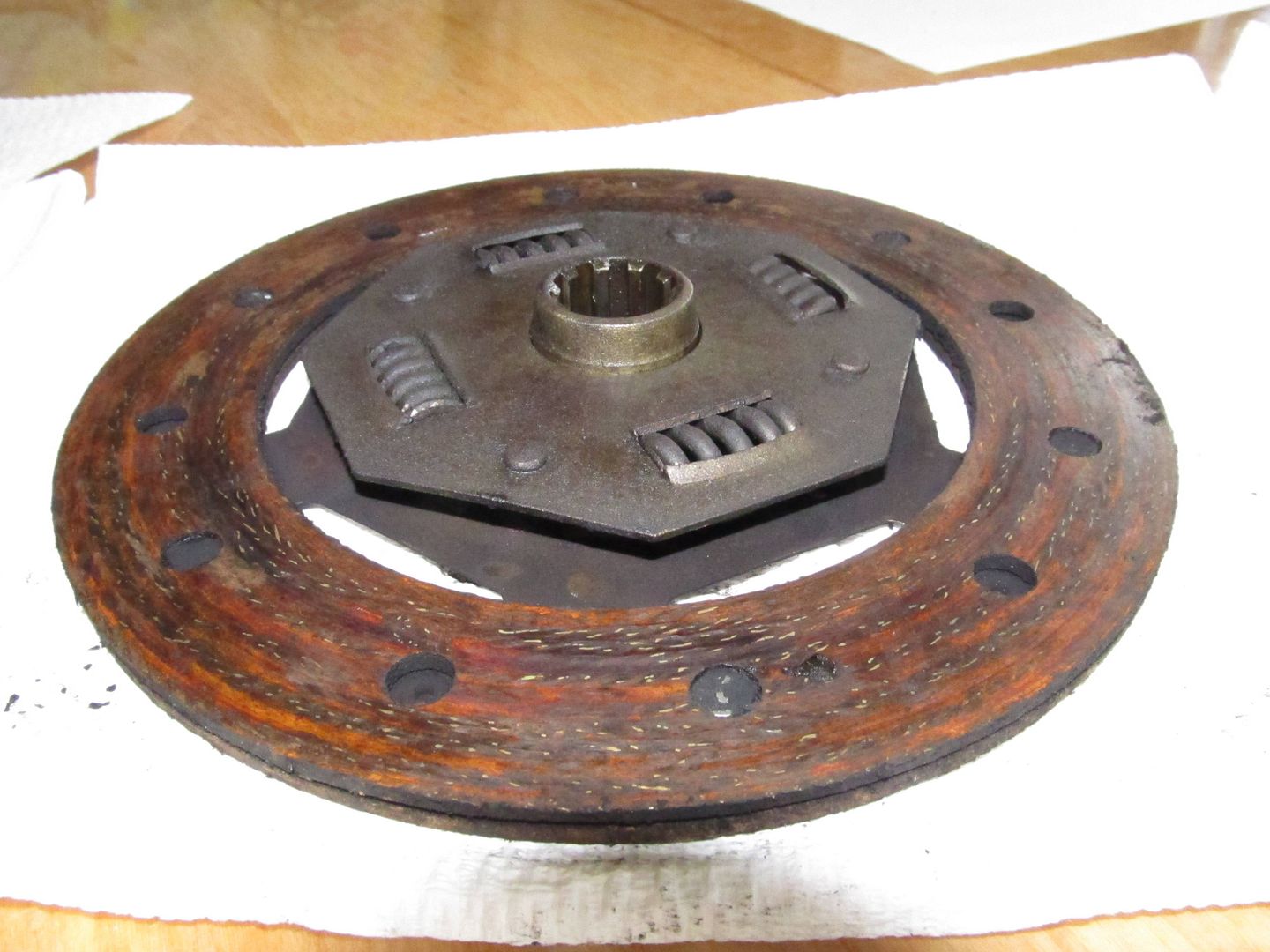 | The disc looks to have wear though does not appear to be scored. A new clutch disc has an uncompressed depth of 8.4mm (+/-0.1mm). Have checked a new disc in the garage and it conforms to this. Also look at the depth of facing before the heads of the rivets would be flush. At New it is 1.5mm apprx each side. Where did you get your new disc. Send it back as it is useless with rivets flush with the facings. Can you show pics of this please?