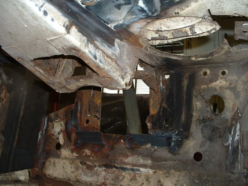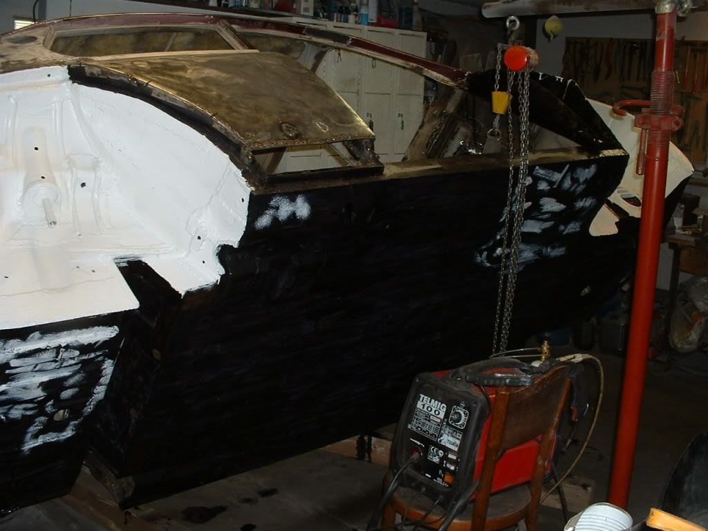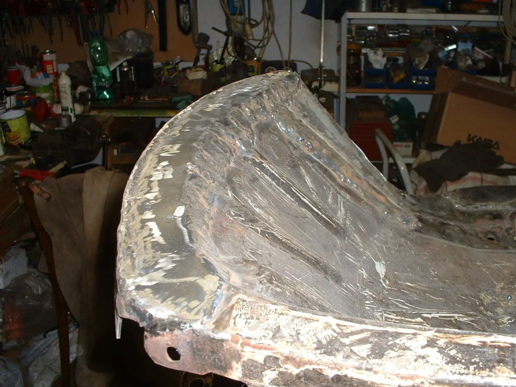 | Hi guys, sorry "John-saab" I probably didn't mentioned that befor rotating it the body skeletron was deprived of all components (motor as well) just bare metal sheet. So I continue with cutting, but the ugliest work wos to get rid of the tar based rust protection. I tryed different recommended methods, but the most effitient was, flame (gas o petrol gadget) spattle, haevy gloves and a mask on face. After that hours of cleening the rests and old mud with high speed angle grinder - steel disc brush. Coal mine was nothing to my garage there.